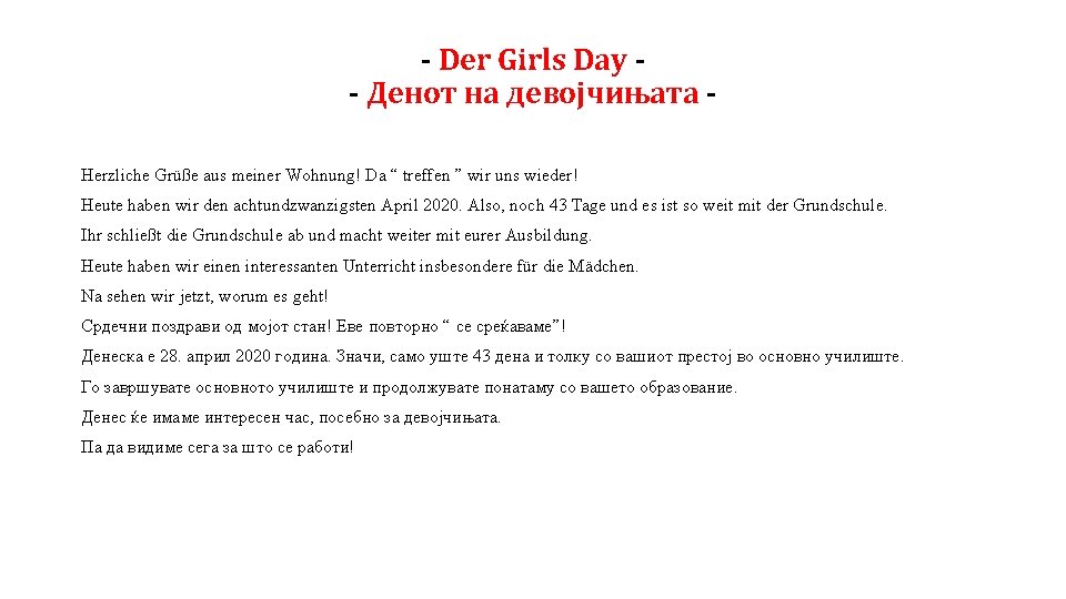 - Der Girls Day - Денот на девојчињата Der “ Mädchentag ” oder “ der Girls Day ” wird seit 2001 gefeiert. Also, das ist ein Tag für Mädchen. Was passiert an diesem Tag? ? ? !!! Heutzutage gibt es immer noch die Unterteilung in männliche und weibliche Berufe. An diesem Tag haben die Mӓdchen die Möglichkeit Berufe kennenzulernen, die als typisch männliche Berufe angesehen werden. Aber warum das jetzt? Die Ergebnisse haben deutlich gezeigt, dass die Mädchen офт viel besseres Wissen in der Schule gezeigt haben als die Jungen, sogar auch in den technischen Fächern. So haben die Mädchen zwischen zehn und fünfzehn Jahren seit 2001 die Mӧglichkeit am vierten Donnerstag im April mit Handwerkern, Automechanikern usw. zu sprechen und diese Berufe auch auszuprobieren. So entscheiden sie sich spӓter vielleicht auch für einen dieser Berufe. Sehr interessant, haben sogar 9 von 10 Mädchen diesen Tag als positiv bewertet. Viele haben sogar an diesem Tag auch ihren Traumberuf gefunden. Meiner Meinung nach gibt es heutzutage keine männlichen und weiblichen Berufe mehr. Das hängt nur von der Person ab. Man kann und darf werden, was man will. Man braucht nur zu lernen und das Ergebnis kommt bald.