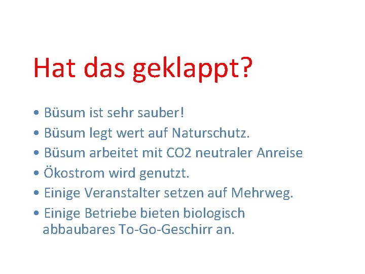 Hat das geklappt? • Büsum ist sehr sauber! • Büsum legt wert auf Naturschutz. • Büsum arbeitet mit CO 2 neutraler Anreise • Ökostrom wird genutzt. • Einige Veranstalter setzen auf Mehrweg.