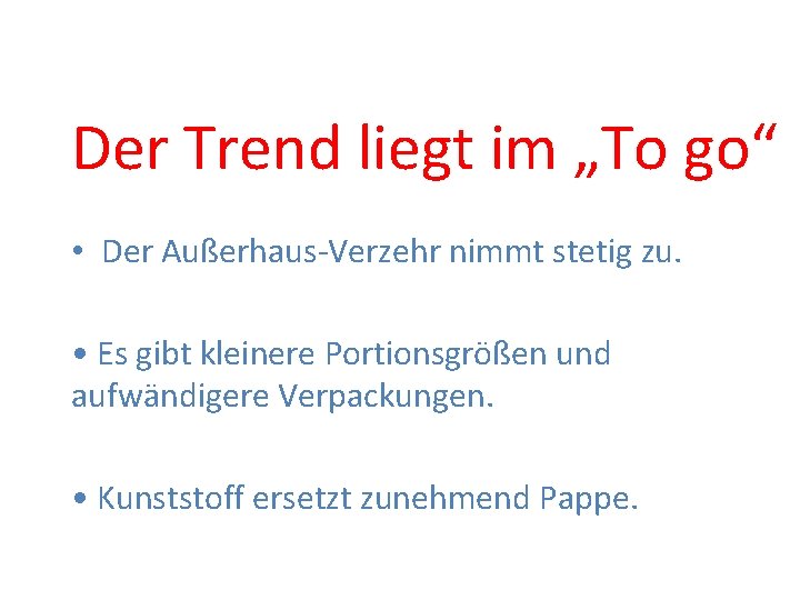 Der Trend liegt im „To go“ • Der Außerhaus-Verzehr nimmt stetig zu. • Es gibt kleinere Portionsgrößen und aufwändigere Verpackungen. • Kunststoff ersetzt zunehmend Pappe.