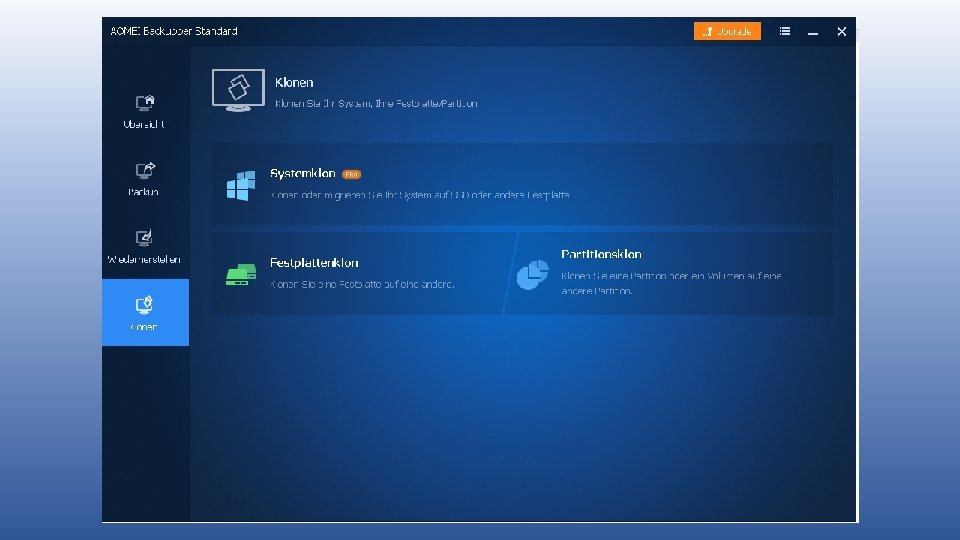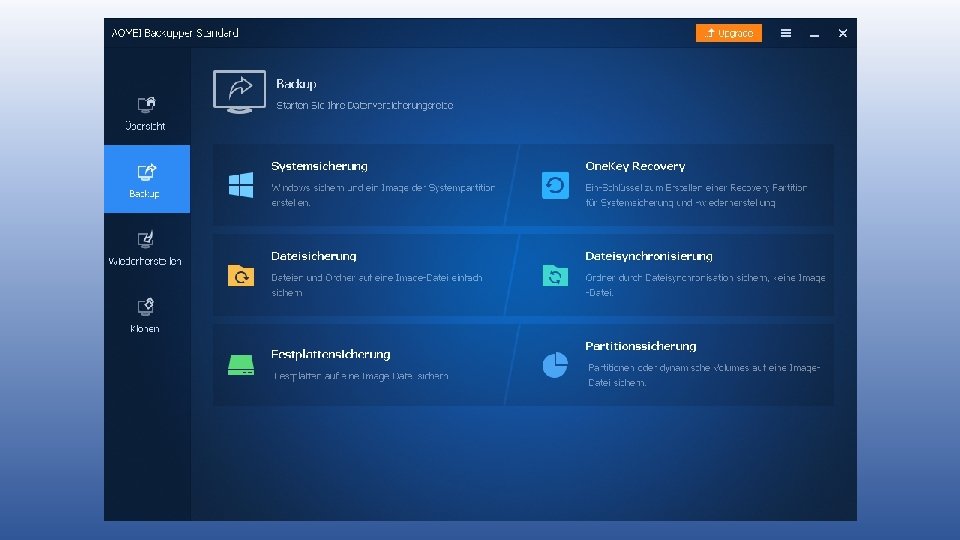 Informationen zu Aomei Backupper Die Gratis-Software „Aomei Backupper Standard“ verfügt über alle wichtigen Funktionen, die man von einem Programm zur Datensicherung erwartet. Sie können Backups von Festplatten und Partitionen, von der Systempartition sowie von Ordnern und Dateien durchführen oder alternativ ausgewählte Verzeichnisse synchronisieren. Beim Backup stehen neben Komplett-Sicherungen auch inkrementelle Backups zur Auswahl. Ebenso einfach klonen Sie mit der Freeware Laufwerke und Partitionen, um so 1: 1 -Kopien auf neuen Datenträgern zu erstellen. Natürlich lässt sich ein Sicherungsvorgang auch timen, also zum Beispiel täglich, wöchentlich und monatlich ausführen oder täglich in stündlichen oder zweistündlichen Intervallen. Als Zielmedium sind beim „Aomei Backupper“ lokale Laufwerke ebenso möglich wie USB- und SSD-Festplatten, Netzwerke und NAS-Server sowie RAID-Systeme. Haben Sie die Desktop-Version eines Cloud-Dienstes wie Dropbox, Google Drive oder One. Drive installiert, nutzt der „Aomei Backupper“ auch diese Ordner ohne Umweg. Das selektive Wiederherstellen von Daten aus Backup- und Image-Dateien ist dialoggesteuert sehr einfach. Auch das Einrichten einer Notfall-CD ist auf Win. PE- bzw. Linux-Basis mit dem Backup-Programm möglich. Sollte Ihr PC von einem Virus befallen sein oder sich nicht mehr starten lassen, greifen Sie so auf die erstellte Datensicherung zurück.