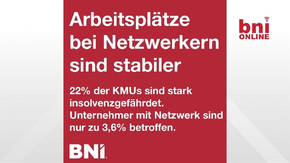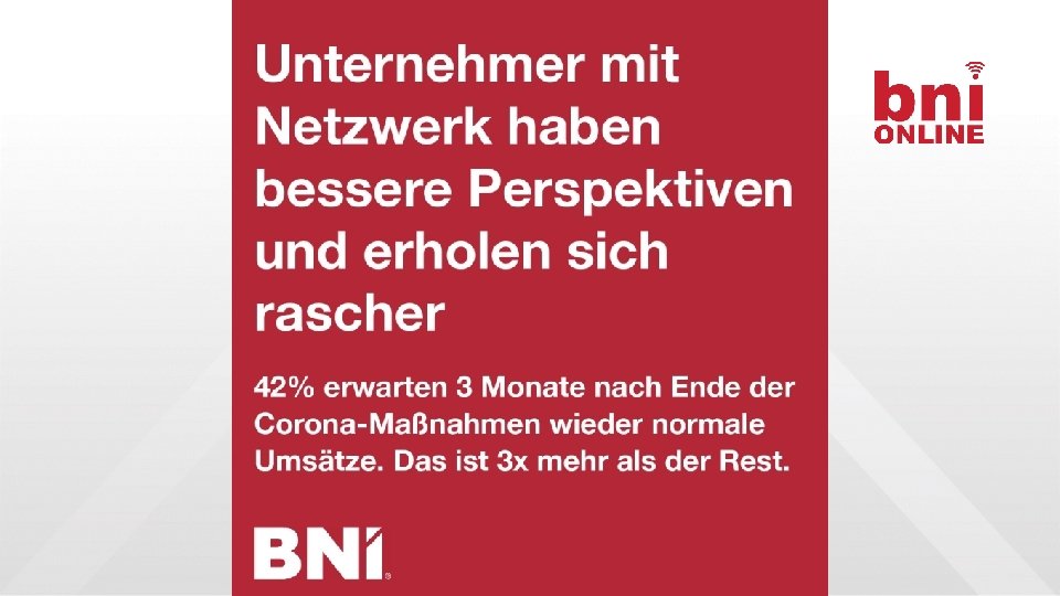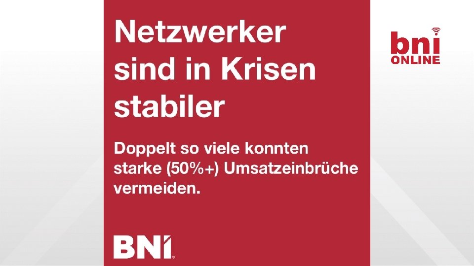 WARUM SIND NETZWERKER BESSERE UNTERNEHMER Wir fordern uns unternehmerisch • Erkläre Deinen USP! • Definiere Zielkunden! • Komm am Punkt! Wir fördern uns menschlich • Geh auf andere ein • Manage Konflikte • Führe ergebnisoffene Gespräche Wir achten anders auf die Umgebung • Lernen Kunden besser kennen • Beginnen andere Branchen zu verstehen • Gewinnen neue Perspektiven • Werden mental offener Wir blicken über den Tellerrand • Vom Ich zum Chapter => Rolle • Vom Chapter zur Region => PD • Von Region zum Land => PD Konferenz • Zum globalen Bürger => BNI U & Co