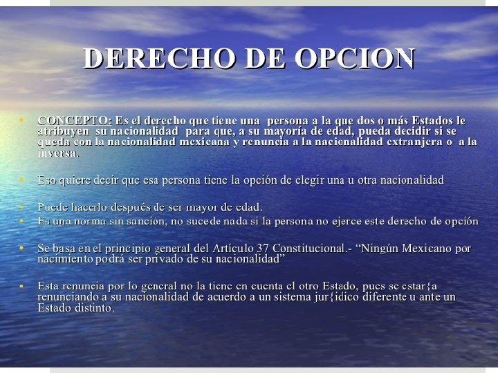 JUS OPTANDI Es el derecho de optar, de elegir la nacionalidad. Un Estado otorga su nacionalidad a una persona por ius solis o ius sanguinis y después de manera provisional, hasta que el sujeto tiene la capacidad de manifestar su voluntad de pertenecer en un país y por tanto de adquirir la nacionalidad.