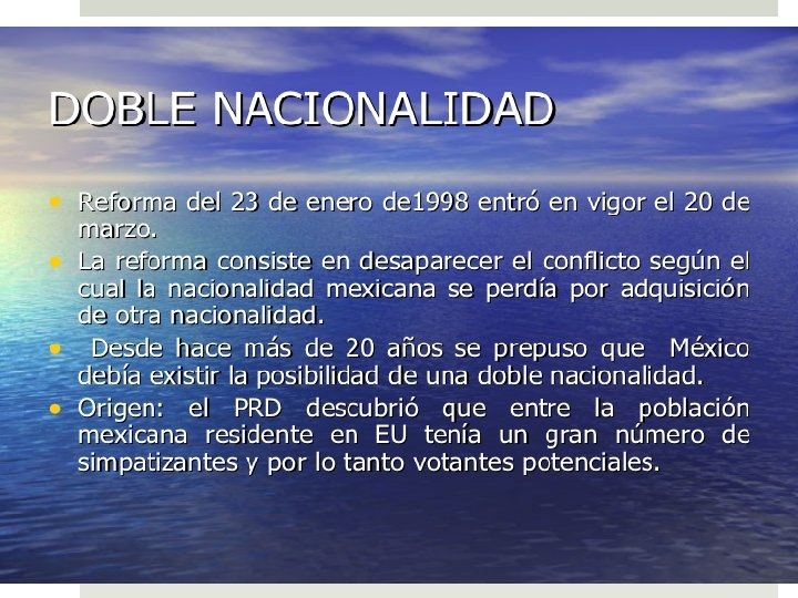 DERECHO DE NACIONALIDAD 1. Toda persona debe tener nacionalidad 2. Ninguna persona puede tener más de una nacionalidad (años 40 -80´s) 3. Toda persona puede optar por otra nacionalidad (naturalización) 4. Toda naturalización fraudulenta es nula de manera absoluta 5. Reconocimiento a la doble o múltiple nacionalidad porque el vínculo de filiacióncon los padres e hijos es irrenunciable (a partir 1980) 6. Principio de efectividad en la nacionalidad. Vínculo de tipo objetivo (residencia, lugar documentos) porque la afectividad es un vínculo subjetivo (sentido de pertenencia).
