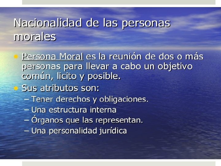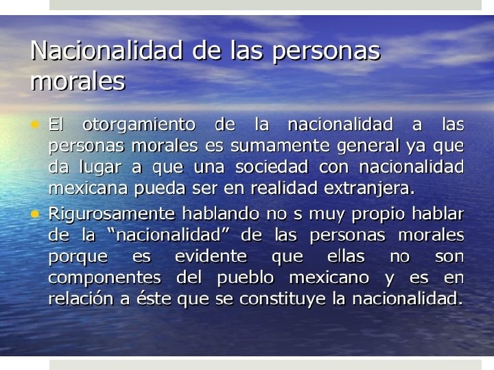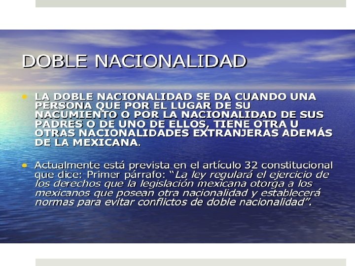 NACIONALIDAD Vínculo de una persona determinada con un Estado particular. Le da derechos de reclamar la protección de mismo y se somete a las obligaciones impuestas por sus leyes. Todos tenemos nacionalidad, excepto los apátridas, lo que nos da una pertenencia a un régimen político de algún Estado. En teoría ningún individuo podría poseer más de una nacionalidad, pero algunos sistemas jurídicos como el mexicano lo permiten.