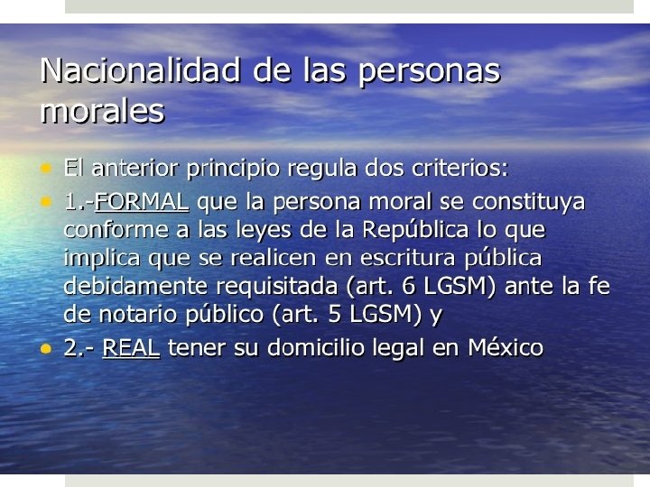 EXTRANJERO Extranjero - Sometido a más de una soberanía - Sujeto a una regulación especial. - Sometidos a la ley de su país (del que son nacionales) y a aquella legislación con la que se vinculan por razón de las personas, las cosas o determinados actos jurídicos, como ocurre cuando una persona traspasa la frontera a otro país, adquiere un inmueble o celebra un contrato cuyos efectos se producirán en otro Estado. - Otro ejemplo, es cuando participan como accionistas.
