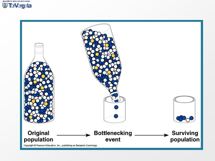 - Con che probabilità una nuova mutazione neutrale in un individuo Hz viene trasmessa? N individui = 2 N alleli la probabilità che venga perduta è (2 N - 1)/2 N la probabilità che venga trasmessa e alla fine fissata è 1/2 N Il numero di generazioni necessarie è molto grande ma il tempo assoluto dipende dalla specie in considerazione! Implicazioni livello: evolutivo; medico; - collo di bottiglia - effetto del fondatore (es. Corea di Huntington regione Maracaibo, Venezuela)