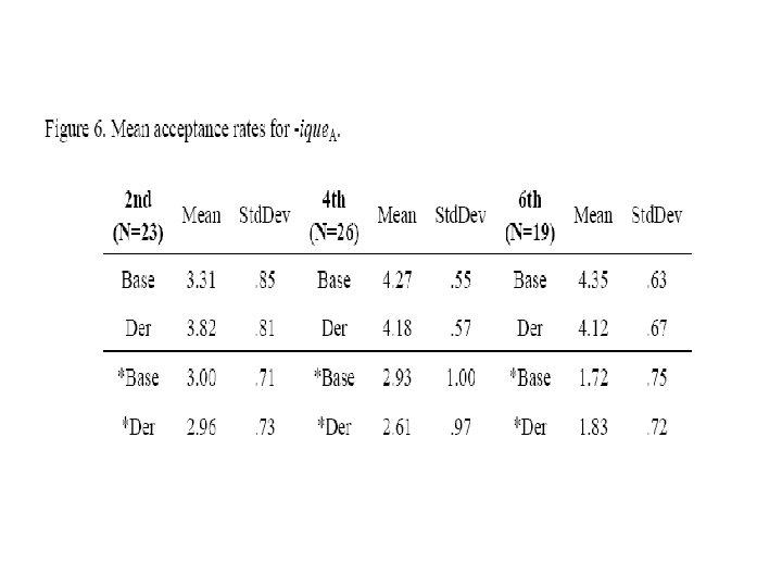 • Subjects: 23 2 nd semester French, 26 4 th semester, 19 6 th semester • Method: A grammaticality Judgment task Derived Base