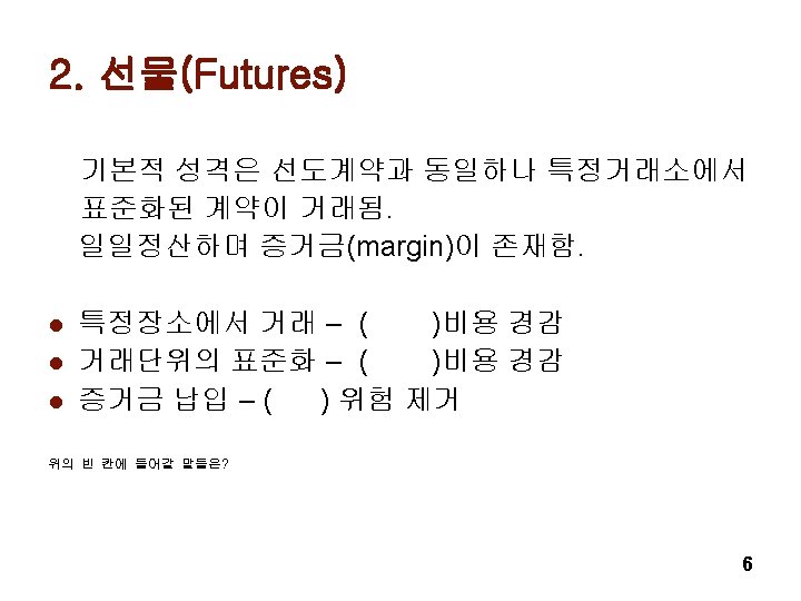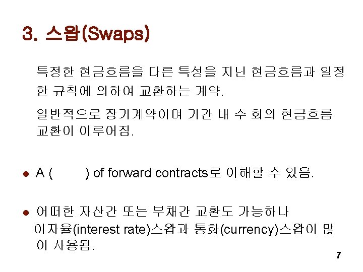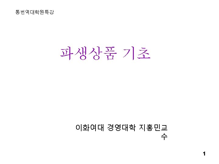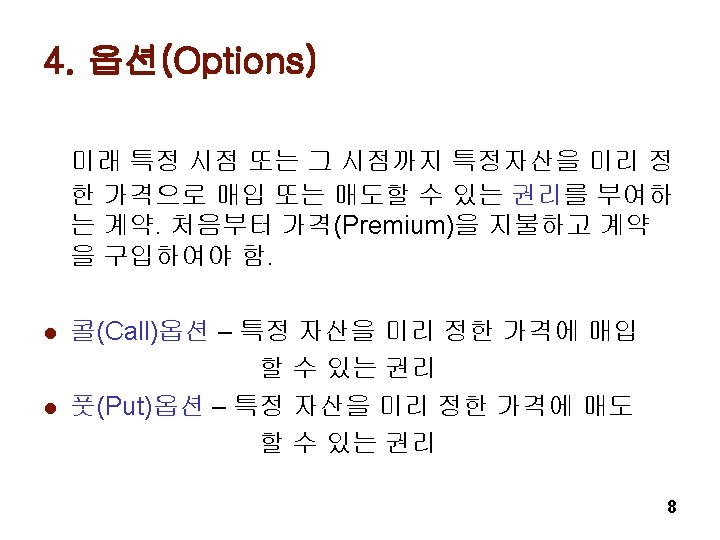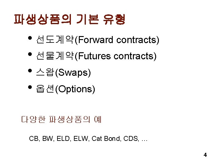 파생상품(Derivatives) 자신의 가치가 다른 기초자산(들)이나 변수(들) 의 가치에 의하여 정해지는 금융수단. A derivative is an instrument whose value depends on the values of other more basic underlying variables 3