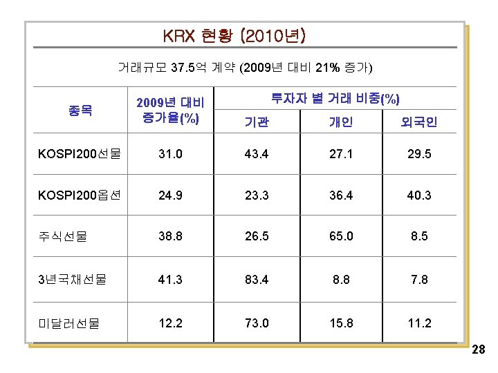 KOSPI 200 Option Underlying Asset Contract Size Contract Months Trading Hours KOSPI 200 Index KOSPI 200 Option Price times KRW 100, 000 The three consecutive near months from the quarterly cycle (3, 6, 9, 12) + one nearest month 09: 00 ~ 15: 15 (09: 00 ~ 14: 50 on the last trading day) Tick Size & Value 0. 05 point(KRW 5, 000) ≥ 3 of premium, 0. 01 point otherwise Last Trading Day Second Thursday of the contract month Final Settlement Day The following day of the last trading day Final Settlement Cash Daily Price Limit 15% of the previous closing price Exercise Style European Listing date 07 -July-97 27