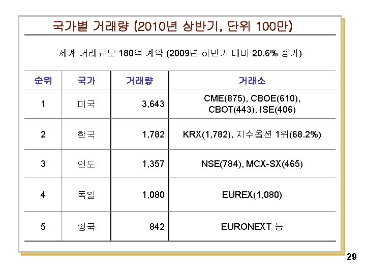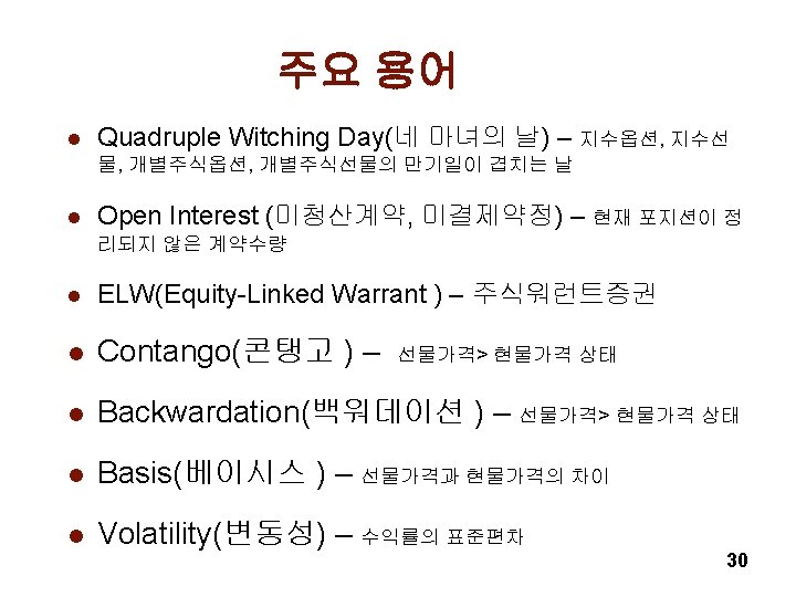Underlying Assets l Stock Index – KOSPI 200, Star Index l Stock – individual stocks l Bond – 3, 5, 10 -year Gov’t Bonds l Currency – U$, Yen, Euro l Commodity – Gold, Lean Hog 25