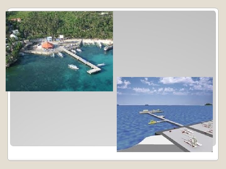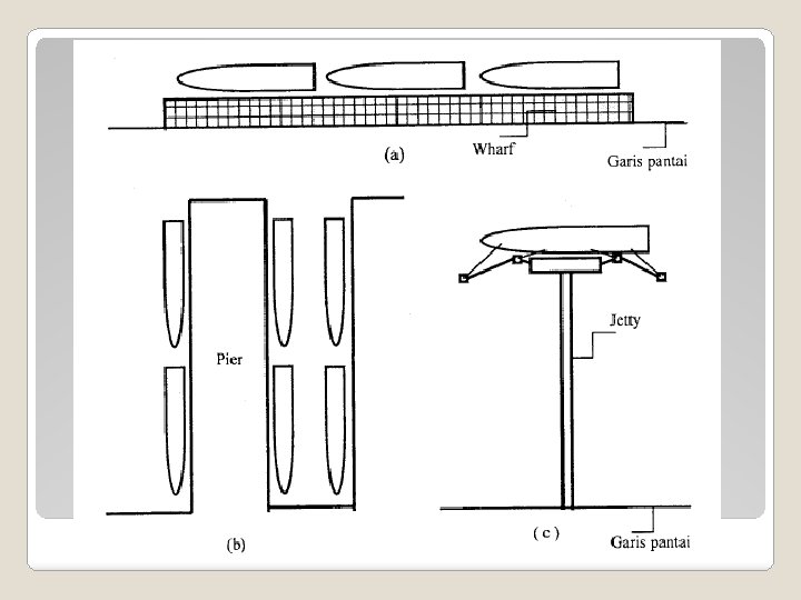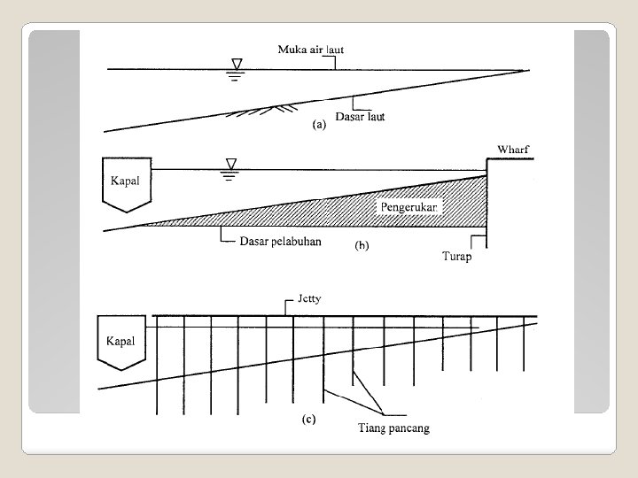 TIPE DERMAGA Dari bentuk bangunannya, dermaga dibagi menjadi dua, yaitu 1. Wharf atau Quay adalah bangunan dermaga yang menempel jadi satu dengan pantai dan umumnya menjadi satu dengan daratan, tanpa dihubungkan dengan suatu bangunan (jembatan). Jenis wharf ini biasanya dipilih bila dasar pantai agak curam atau kedalaman air yang dalam, tidak terlalu jauh dari garis pantai. Kebanyakan digunakan untuk pelabuhan barang potongan atau peti kemas