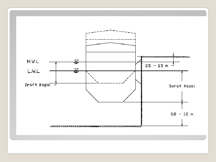 Kedalaman Dermaga Pada Umumnya kedalaman dari dasar kolam pelabuhan/dermaga ditetapkan berdasarkan sarat maksimum (maximum draft) kapal yang bertambat ditambah jarak aman (clearence) sebesar (0, 8 – 1, 0) m di bawah lunas kapal dan perbedaan pasang surut. Taraf dermaga ditetapkan antara (0, 5 – 1, 5 ) m di atas H. W. L dengan memperhatikan ketinggian gelombang maksimum di depan dermaga. Lebih lengkapnya bisa dilihat pada gambar berikut ini