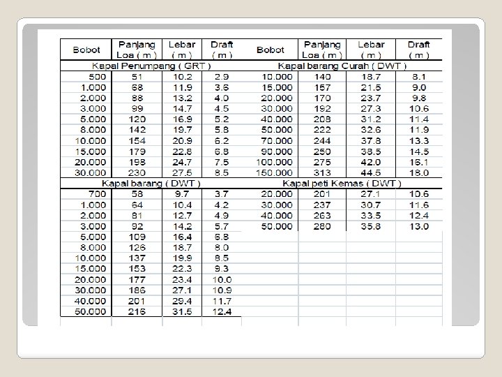 Contoh soal Sebuah pelabuhan direncanakan melayani kapal barang curah dengan DWT 10. 000 ton sebanyak 5 unit. Bila perbedaan pasang surut adalah 2 meter, rencanakan panjang dan kedalaman dermaga Pada data kapal rencana digunakan kapal dengan bobot kapal (Gross tonnage) 10. 000 ton dengan jumlah kapal rencana 5 kapal. Kapal dengan bobot (gross tonnage) 10. 000 ton memiliki panjang 140 m (Kapal barang curah) sehingga panjang dermaga adalah sebagai berikut.
