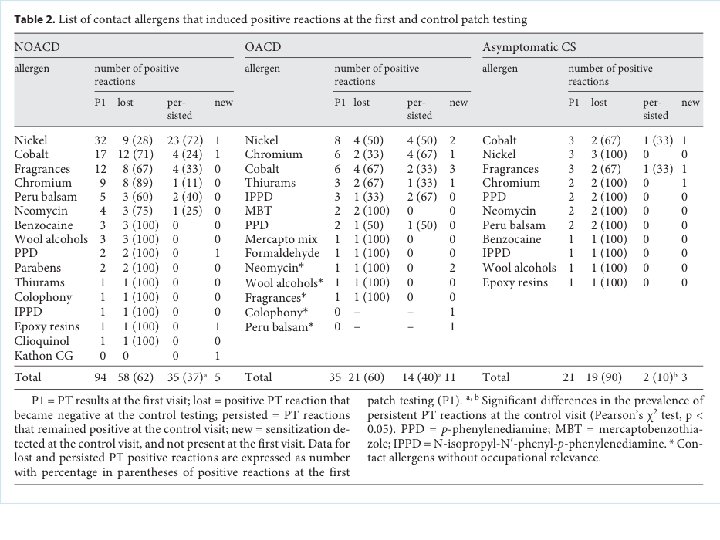ANALISI DEI CONTATTANTI: novità? 361 pazienti con sospetta OCD (occupational contact dermatitis) 228 diagnosi di OCD, di cui 118 ICD (irritant contact dermatitis) AGENTE N° PAZIENTI Wet work 64 Guanti 45 Traumi meccanici 19 Olii 15 Irritanti chimici specifici 9 Contact Dermatitis. 2014 Dec; 71(6): 364 -70. doi: 10. 1111/cod. 12290. Epub 2014 Oct 10.