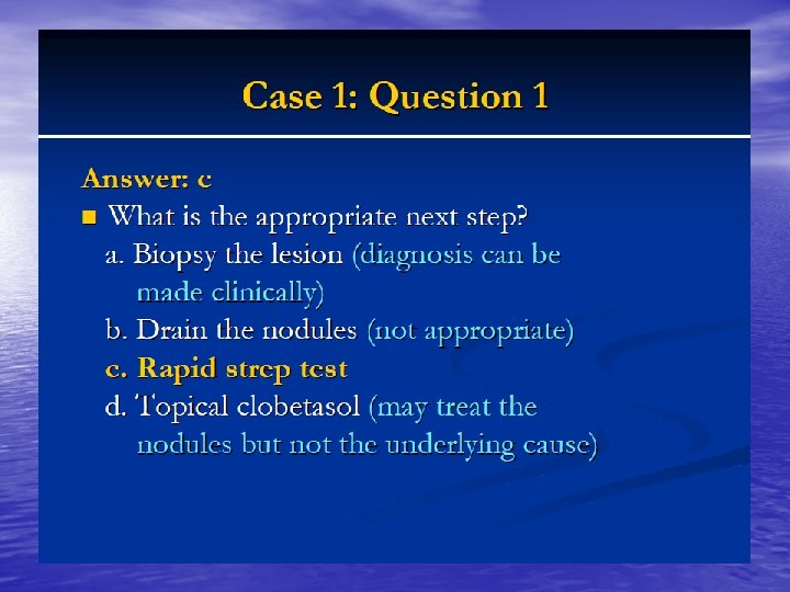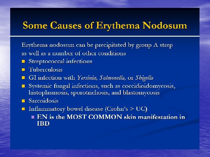 • • • Gastrointestinal tract and the skin Crohn, s disease ”regional ileitis” Perianal abscess and fisulae. Erythema nodosum Erythema multiforme Aphthous-like stomatitis and glossitis. Cutaneous vasculitis. Epidermolysis bullousa acquisita. Metastatic Crohn, s disease as numerous eroded cutaneous granulomas at sites distant from the affected intestine. Pyoderma gangrenosum.