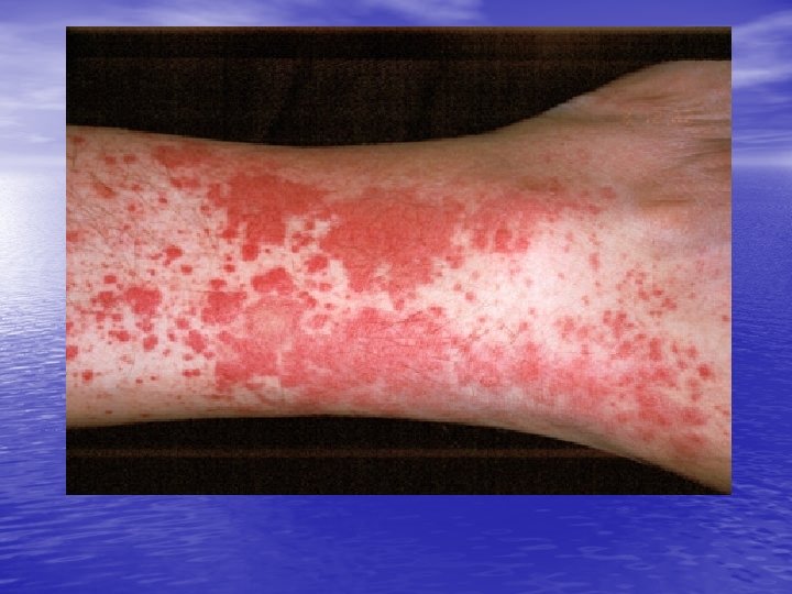 • D- Necrobiosis lipoidica • Treatment: control of diabetes doesn’t help in disappearance of the lesions. – Intralesional steroids. – Systemic aspirin: 300 mg/day and dipyridamole 75 mg/day. – Nicotineamide – Ticlopidine as antiplatelet – pentoxyfylline. – Preilesional heparin injection - Oral cyclosporin - Photochemotherapy (PUVA)