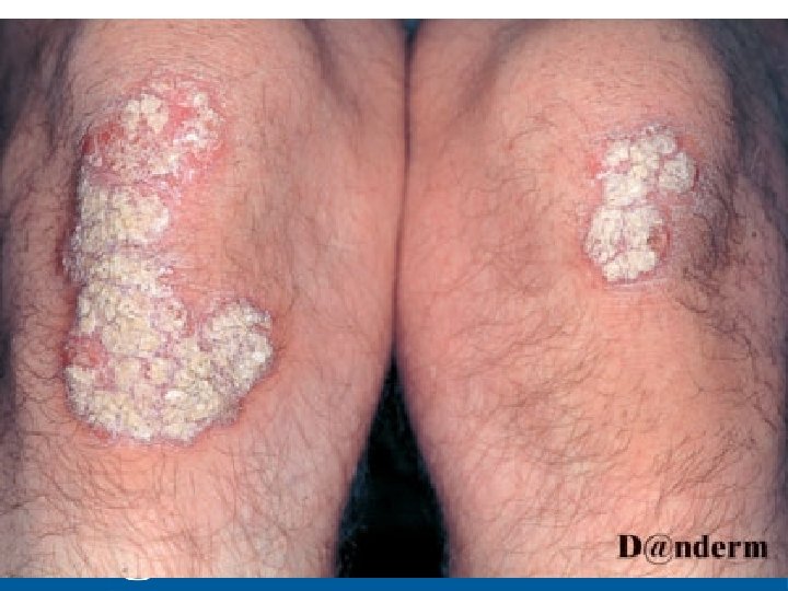 Psoriasis - plaque • Erythematous plaques with silvery scale over both knees • Plaques areas of palpable skin change over. 5 cm in diameter