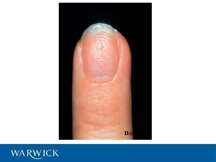 Pitting • Nail dystrophy (a good general term to describe any nail abnormality) • Nail pitting and onycholysis (the nail plate has come away from the nail bed distally