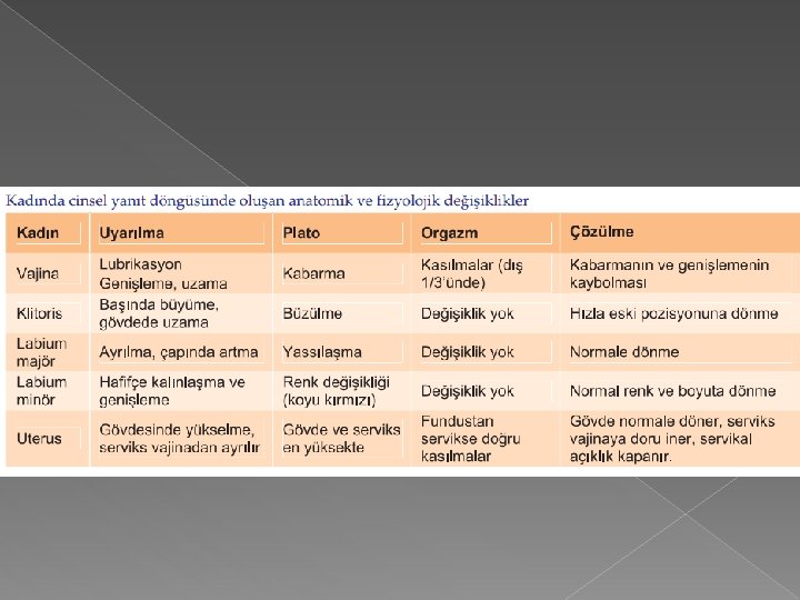 Kadında Cinsel İşlevin Fizyolojisi ve Cinsel Yanıt Döngüsü � a) Uyarılma evresi � b) Plato evresi � c) Orgazm evresi � d) Çözülme evresi