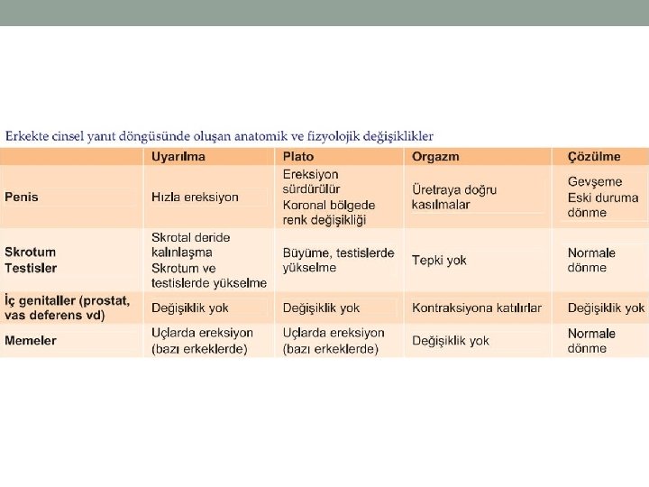 Erkekte Cinsel İşlev Fizyolojisi ve Cinsel Yanıt Döngüsü c) Orgazm evresi: Bu evrede ejakulasyon gerçekleşir. Orgazm evresi boyunca testis derisi ve testislerde plato evresinde oluşan değişikliklere ek başka bir şey gözlenmez. Page 15