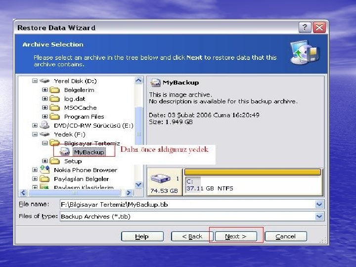 Aldığımız yedeği nereye kopyalayacağınızı seçin. C diskinin yedeğini alıyorsanız, d diskini seçin. Next'e basın.