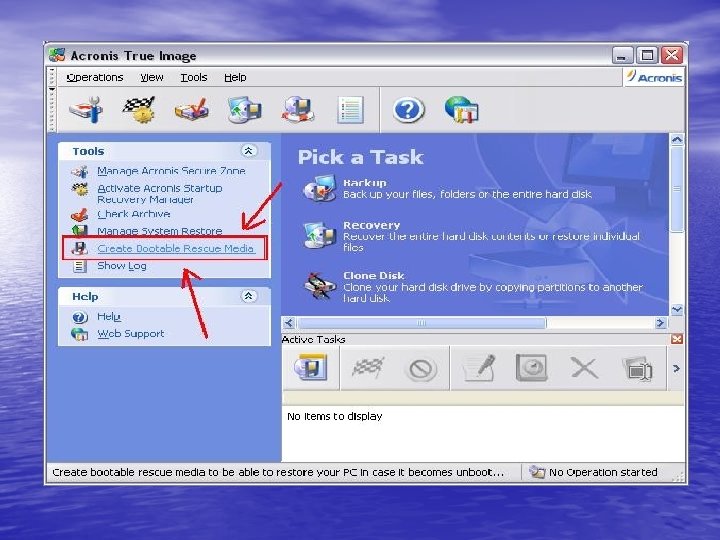 • İşaretlediğin yere basarak boş bir CD'i takıyoruz ve boot CD'si oluşturuyoruz. Bilgisayar açılmadığı zaman bilgisayarı bu CD'den boot ediyoruz ve Acronis açılıyor. Kolay gelsin…… )))