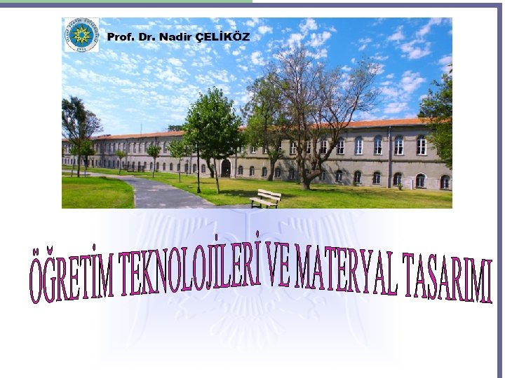 DERS: EĞT 2022 ÖĞRETİM TEKNOLOJİLERİ VE MATERYAL TASARIMI TEORİK : 3 KREDİSİ: 3 ÖĞRETİM ELEMANI: Prof. Dr. Nadir ÇELİKÖZ ODA NO: 118 SAAT: 13. 30 - 16. 15 DERS KITABI: Edt: Özcan Demirel-Eralp Altun (2007), Öğretim Teknolojileri ve Materyal Tasarımı, , Pegem Yayıncılık, Ankara E-POSTA : ncelikoz@gmail. com