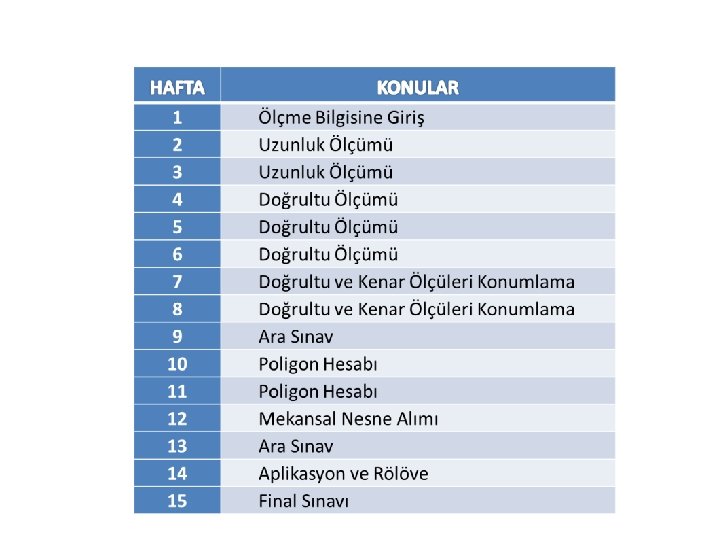 Kavramsal Kazanımlar: Yeryuvarının matematiksel ve fiziksel şekli, jeodezik metrolojinin konusu ve ölçü büyüklükleri, belirsizlik ve hata kavramı, koordinat sistemleri ve ölçüler ile koordinatlar arasındaki fonksiyonel ilişkiler. Uygulamalar: Belirsizlik hesabı Ölçüler ile bilinmeyenler arasındaki fonksiyonel hesaplamalar E. GÜLAL