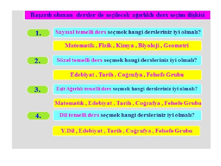 • Özellikle de toplumumuzda zeki öğrenciler Sayısal dersleri seçer gibi yanlış bir algı vardır. • Dersler arasında böyle bir hiyerarşi söz konusu değildir. • Öğrenci kendi yeteneklerine göre ders seçmelidir. Yeteneklerine göre ders seçen öğrenci ancak başarılı olabilir. • Sayısal dersleri kötü olan öğrenci sayısal seçtiğinde başarısızlığa uğramakta üniversite giriş sınavında da istediği başarıyı kazanamamaktadır.