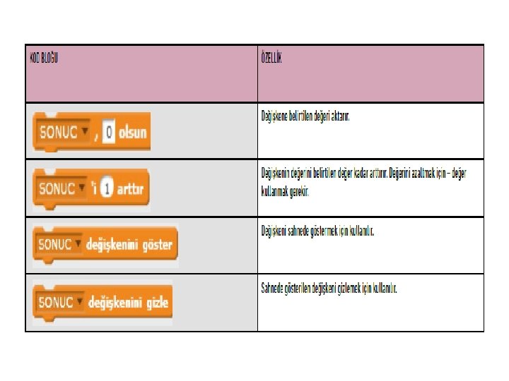 Değişken Oluşturma: • Scratch programlama dilinde bir değişken oluşturmak istediğimizde Veri kategorisinden “Bir Değişken Oluştur” butonuna