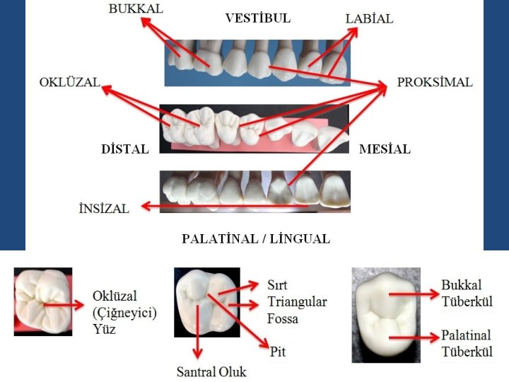 Yön Ayırımı • Orantısal olarak palatinal tüberküller, bukkal tüberküllerden daha küçüktür. • Bukkal tüberkül tepesi 1. premolar dişte kron uzun ekseninin daha distalinde, 2. premolar dişte ise daha mesialinde yer alır. • Mesial trianguler fossa, distaldekinden daha derindir. • Kök ucları distale eğimlidir ve 1. premolar dişte daha büyük ve uzun olan kök bukkalde yer alır.