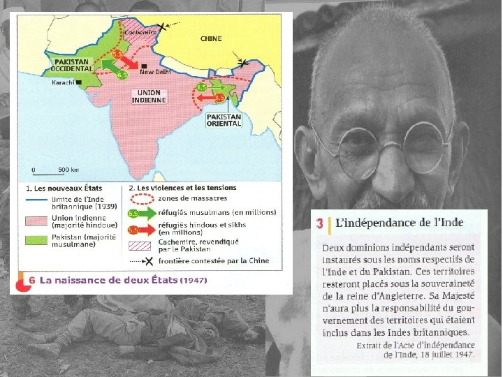 Les mouvements indépendantistes se développent alors et s’expriment de manière pacifique (boycotts, grèves) ou violente (attentats, guerre). La décolonisation prend donc différentes formes selon les pays. Le Royaume-Uni est prêt à négocier avec son empire colonial car il lui apparait impossible de rétablir son autorité. Il préfère donc abandonner sa souveraineté politique pour garder ses avantages économiques. La décolonisation anglaise s’effectue donc pacifiquement entre 1947 et 1957. Elle est préparée par un transfert progressif des pouvoirs à des gouvernements nationaux. L’Inde déclare son indépendance en 1947, mais elle est divisée en deux : l’Union indienne et le Pakistan pour des raisons religieuses. Gandhi, chef de file de l’Indépendance et figure de la non-violence, est assassiné en 1948. Nehru dirige alors l’Inde. Au contraire, la France veut au départ conserver son empire et son autorité sur lui. Les indépendances sont acquises à la suite de graves troubles voire de guerre comme la guerre d’Indochine (conflit de la guerre froide) qui voit la défaite de la France en 1954. En Afrique la France adopte deux attitudes : - Pour l’Afrique noire, l’indépendance des Etats comme la Guinée est obtenue relativement facilement entre 1958 et 1960. Des liens économiques, culturels, militaires… sont maintenus avec la France. - en revanche en Afrique du Nord, le Maroc et la Tunisie obtiennent l’indépendance après une période de troubles. - En Algérie le soulèvement de 1945 est durement réprimé et une guerre se déclenche en 1954 se terminant en 1962. L’Algérie est déclarée indépendante après les accords d’Evian de 1962, ce qui provoque le retour des français d’Algérie : les « pieds-noirs » quittent massivement le pays.