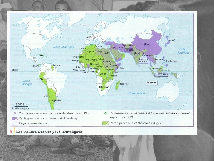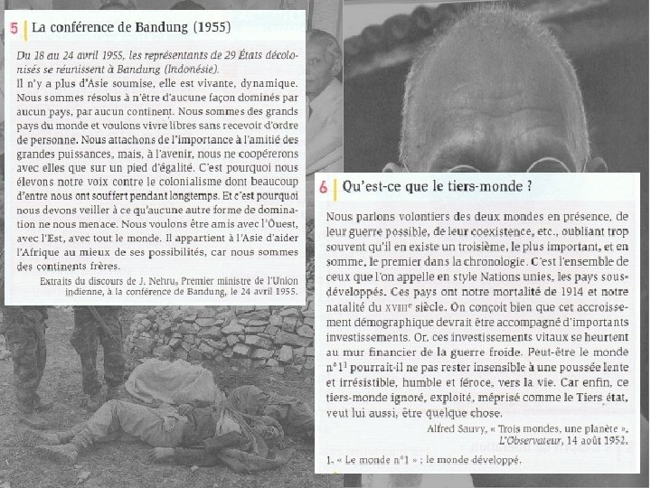 Ces nouveaux Etats s’affirment sur le plan international en organisant ou en participant à des conférences. - En 1955 à Bandoung (Indonésie), une conférence réunissant 29 pays indépendants d’Asie et d’Afrique condamne le colonialisme. Elle le condamne car de nombreux pays souffrent encore de la colonisation, notamment les colonies françaises… Nehru se prononce avec d’autres pays pour une indépendance vis-à-vis deux blocs. C’est la naissance du Tiers-Monde - Après cette conférence, ces pays affirment leur neutralité par rapport aux deux blocs, ce sont les non-alignés. A partir des années 1960, les pays du Tiers. Monde sont majoritaires à l’ONU, et demandent donc un nouvel ordre économique mondial pour plus de justice entre les pays pauvres et les pays riches.