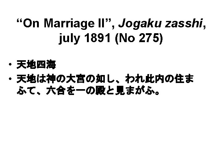 Kekkon ron 結婚論 “On Marriage” • - “On Marriage I”, Jogaku zasshi, feb 1891 (No 254) : “Two Pathetic Stories”