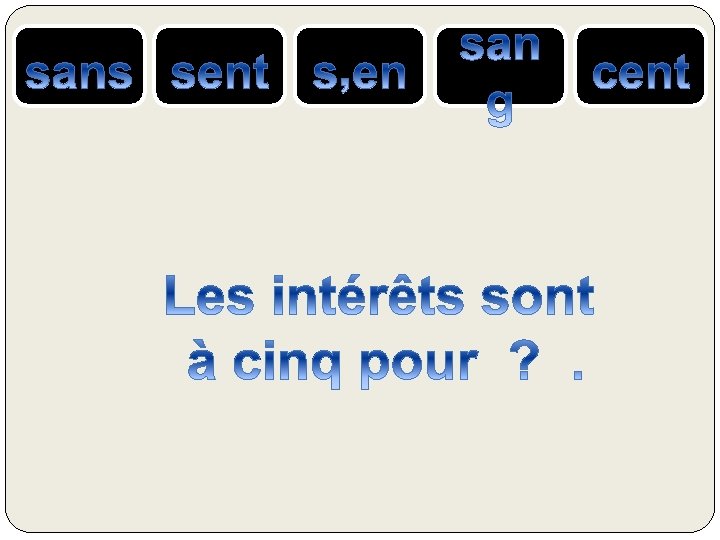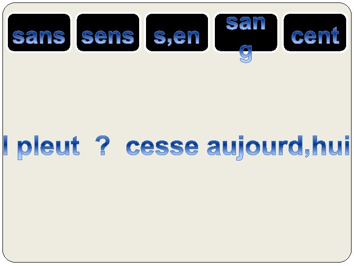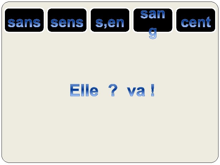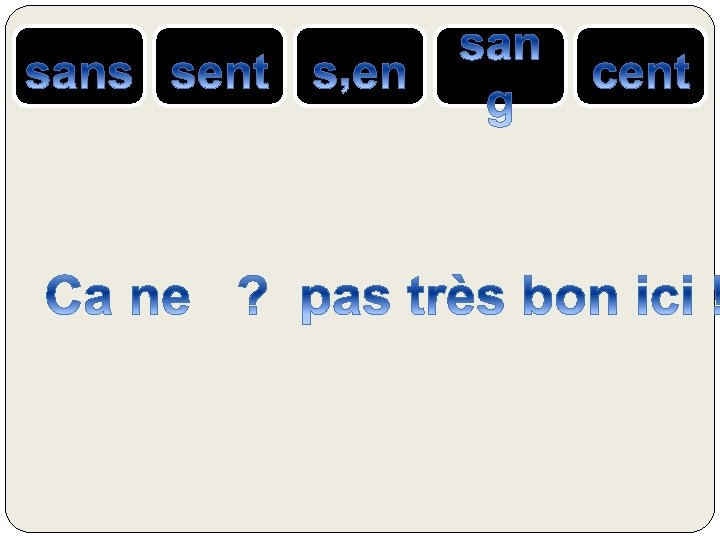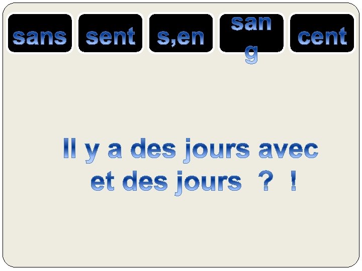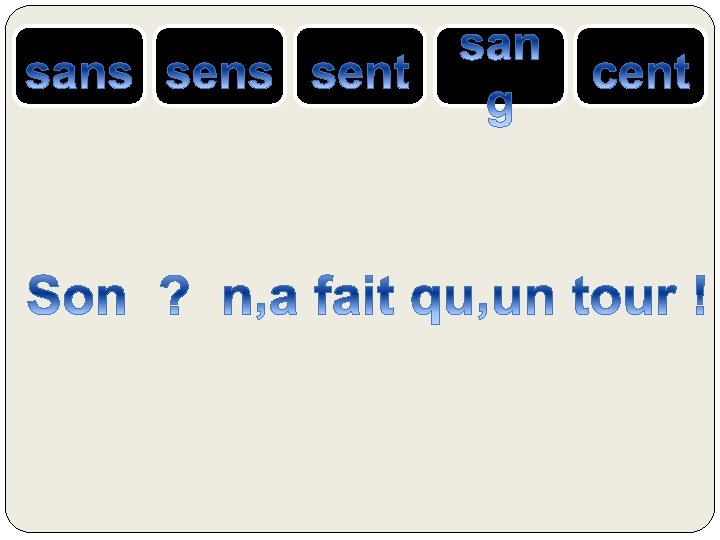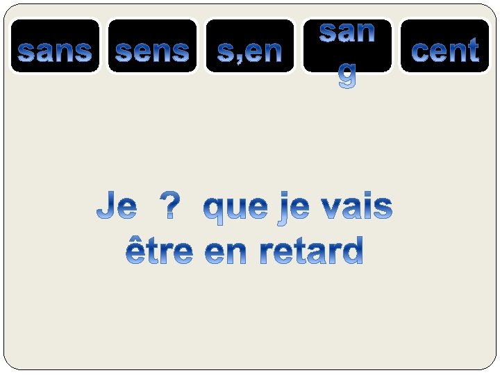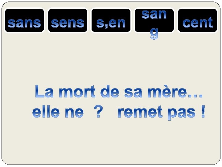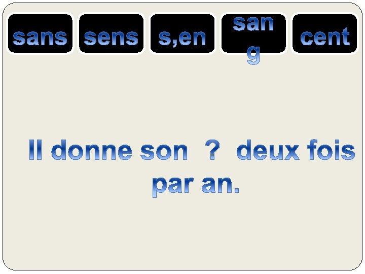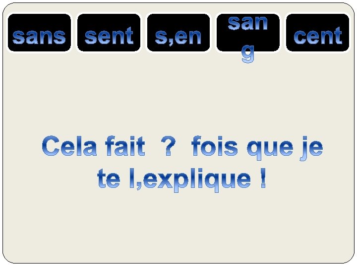 le SANG = liquide rouge qui coule dans nos veines SENS ou SENT= verbe sentir CENT = nombre 100 S’EN = se + pronom « en » SANS = contraire de avec, qui n’a pas ….