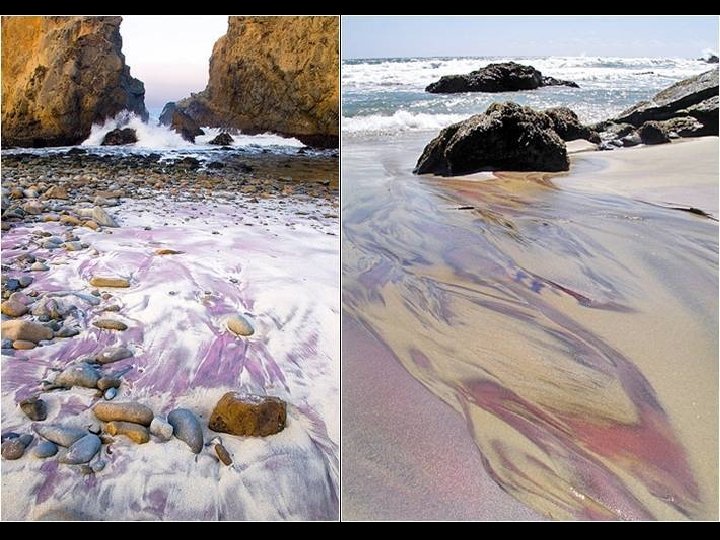 Sous l'action des vagues, les formes et les tournures de minuscules cristaux se changent et créent des reflets magnifiques, rouges, magenta et violets.