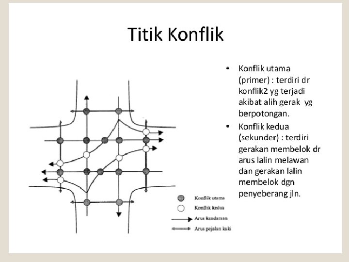 �Lintasan-lintasan kendaraan saling berpotongan pada titik-titik konflik �Persimpangan dengan jumlah kaki yang lebih besar dari empat adalah tidak direkomendasikan, karena jumlah titik konflik menjadi sangat tinggi �Pada persimpangan yang memiliki dua-lajur, dua-arah, dan empat kaki, terdapat 16 titik potensi persinggungan persilangan, delapan persinggungan penggabungan delapan persinggungan penyebaran.