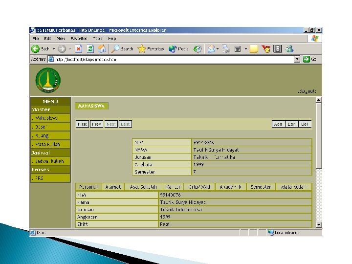 Penjelasan : Pada proses 1. 0, pihak STIMIK Perbanas akan memberikan slip pembayaran pertama, setelah mahasiswa membayar uang kuliah untuk semester yang akan datang, mahasiswa menukarkan bukti pembayarannya dengan user dan password yang nantinya dapat digunakan untuk proses pengisian Formulir Rencana Studi (FRS). Bila waktu pengisian Formulir Rencana Studi tiba, mahasiswa melakukan login untuk bisa masuk ke menu pengisian FRS. Pada proses ini, berhubungan dengan database mahasiswa, yang dimaksudkan untuk menulis pada database mahasiswa apabila mahasiswa tersebut sudah membayar uang kuliah, dan apabila mahasiswa telah melakukan login, maka status login pada database mahasiswa akan bernilai true (yang berarti mahasiswa tersebut sudah pernah login ke sistem).