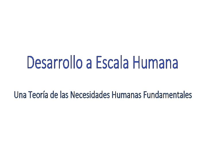 Desarrollo a Escala Humana Antonio Elizalde / Manfred Max-Neef / Martín Hoppenhayn Dos postulados básicos: El desarrollo se refiere a las personas y no a los objetos Además, el Desarrollo a Escala Humana postula que la economía convencional incurre en un error fundamental: predica que las necesidades humanas son crecientes e ilimitadas. El Desarrollo a Escala Humana explica la confusión: estas no son las necesidades, si no los bienes económicos y satisfactores de los que se espera la satisfacción de aquellas. Las necesidades humanas son pocas, delimitadas y clasificables. Son constantes en toda época histórica y cultura. 9(10)necesidades consensuadas universalmente. También pueden ser vistas como "potencialidades": SUBSISTENCIA ENTENDIMIENTO IDENTIDAD PROTECCIÓN PARTICIPACIÓN LIBERTAD AFECTO CREACIÓN OCIO TRASCENDENCIA (según los autores no totalmente consensuada)