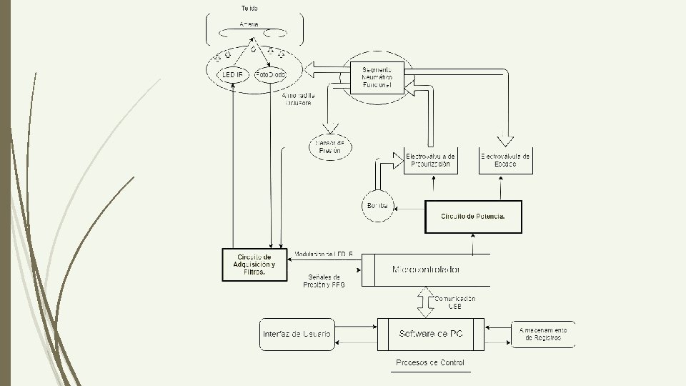 Circuito de Señales Señal FPG Adimensional. Fotodiodo: Señal de corriente. Señal Modulada: Filtros. Señal de Presión Selección de Sensor. Exactitud: +- 3 mm. Hg. Amplificación. Acondicionamiento.