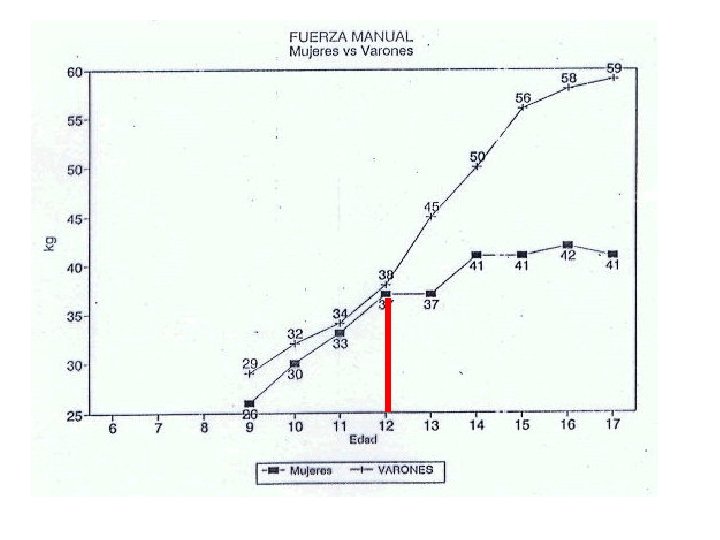 Ganancia de fuerza según el PMC (Pico máximo de velocidad de crecimiento) PMC 9 Kg/ año 6 3 1 -6 -4 -2 0 Diferencia en años +2 +4 Carron y Baley / 74 Se ha estudiado a chicos con un rango de edad entre los 10 y los 18 años, mediante diversos tests (salto vertical, flexiones de brazos, salto horizontall y otros), para analizar la relación entre los resultados de estos tests de fuerza y de rendimiento motor y la edad del PMC. Los resultados indican que la mejora es más evidente inmediatamente después de alcanzar el pico de velocidad de incremento en la estatura.