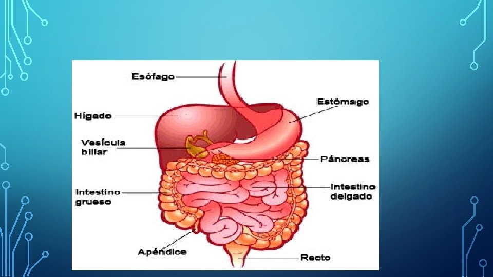 APARATO DIGESTIVO • El aparato digestivo está formado por el tracto digestivo, una serie de órganos huecos que forman un largo y tortuoso tubo que va de la boca al ano, y otros órganos que ayudan al cuerpo a transformar y absorber los alimentos. • Los órganos que forman el tracto digestivo son la boca, el esófago, el estómago, el intestino delgado, el intestino grueso (también llamado colon), el recto y el ano. El interior de estos órganos huecos está revestido por una membrana llamada mucosa. La mucosa de la boca, el estómago y el intestino delgado contiene glándulas diminutas que producen jugos que contribuyen a la digestión de los alimentos. El tracto digestivo también contiene una capa muscular suave que ayuda a transformar los alimentos y transportarlos a lo largo del tubo. • . La digestión es el proceso mediante el cual los alimentos y las bebidas se descomponen en sus partes más pequeñas para que el cuerpo pueda usarlos como fuente de energía, y para formar y alimentar las células.