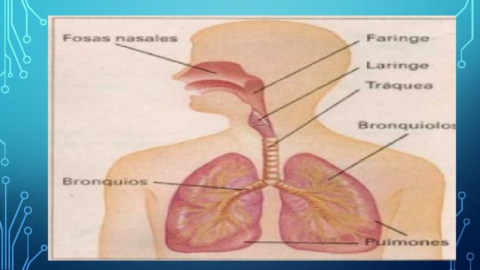 • La respiración es el proceso por el cual ingresamos aire (que contiene oxígeno) a nuestro organismo y sacamos de él aire rico en dióxido de carbono. Un ser vivo puede estar varias horas sin comer, dormir o tomar agua, pero no puede dejar de respirar más de tres minutos. Esto grafica la importancia de la respiración para nuestra vida. • El sistema respiratorio de los seres humanos está formado por: • Las vías respiratorias: son las fosas nasales, la faringe, la laringe, la tráquea, los bronquios y los bronquíolos. La boca también es, un órgano por donde entra y sale el aire durante la respiración. • Las fosas nasales son dos cavidades situadas encima de la boca. Se abren al exterior por los orificios de la nariz (donde reside el sentido del olfato) y se comunican con la faringe por la parte posterior. En el interior de las fosas nasales se encuentra la membrana pituitaria, que calienta y humedece el aire que inspiramos. De este modo, se evita que el aire reseque la garganta, o que llegue muy frío hasta los pulmones, lo que podría producir enfermedades. No confundir esta membrana pituitaria con la glándula pituitaria o hipófisis.