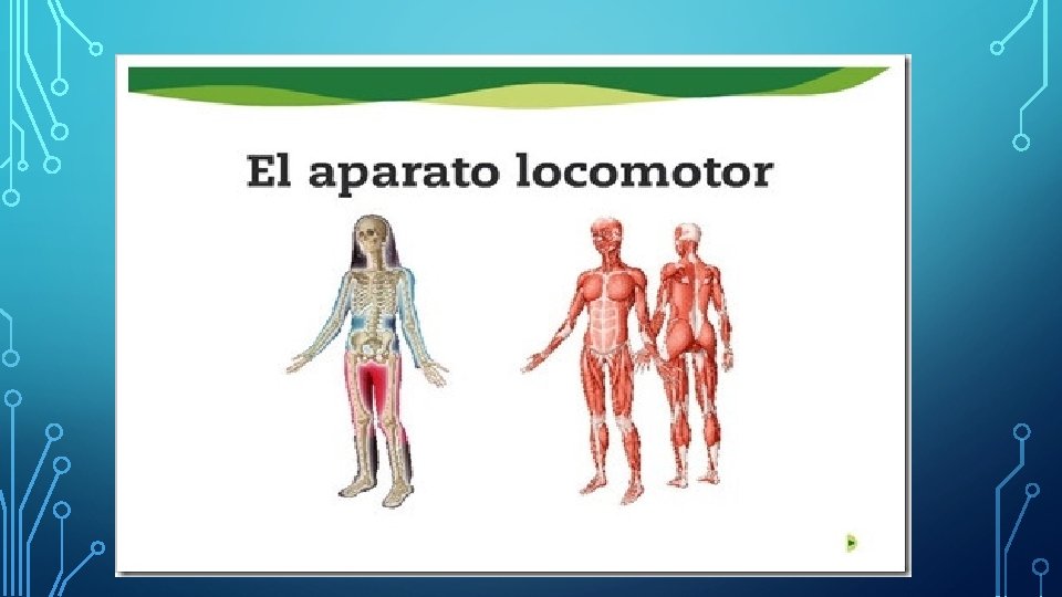 APARATO LOCOMOTOR • el sistema locomotor esta formado por El sistema óseo (huesos, articulaciones y ligamentos) y el sistema muscular (músculos y tendones que unen los huesos). Permite al ser humano o a los animales en general interactuar con el medio que le rodea mediante el movimiento o locomoción y sirve de sostén y protección al resto de órganos del cuerpo. • • Se fundamenta en tres elementos: Huesos. Articulaciones Músculos