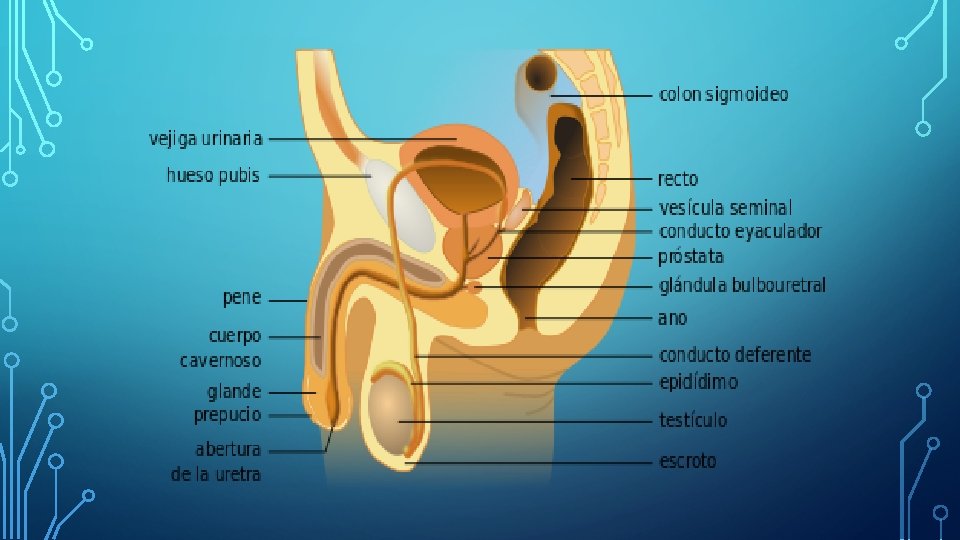 APARATO REPRODUCTOR MASCULINO • El aparato reproductor masculino es, junto con el femenino, el encargado de la reproducción, es decir, la formación de nuevos individuos. • Los principales órganos internos son los testículos, el epidídimo, los conductos deferentes y las glándulas accesorias. El pene, por su parte, es un órgano externo, junto con el escroto, el saco que envuelve los testículos. • Los testículos producen espermatozoides y liberan a la sangre hormonas sexuales masculinas (testosterona). Un sistema de conductos que incluyen el epidídimo y los conductos deferentes almacenan los espermatozoides y los conducen al exterior a través del pene. En el transcurso de las relaciones sexuales se produce la eyaculación que consiste en la liberación en la vagina de la mujer del líquido seminal o semen. El semen está compuesto por los espermatozoides producidos por el testículo y diversas secreciones de las glándulas sexuales accesorias que son la próstata y las glándulas bulbouretrales