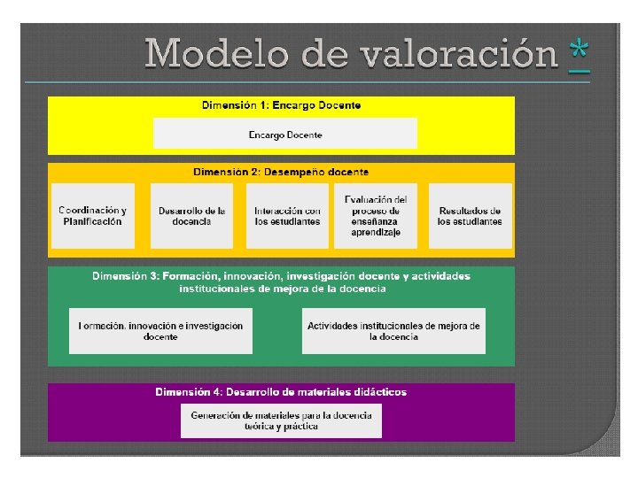 DIMENSIONES DE LA VALORACIÓN 1. 1. Participación en la vida del centro, en los órganos colegiados y de coordinación docente, así como trabajo en equipo e iniciativas para mejorar la práctica docente. 1. Dedicación al centro 1. 2. Colaboración y puesta en marcha de actividades complementarias que dinamicen la vida del centro y contribuyan al aprovechamiento de los recursos del entorno. 1. 3. Atención a padres y alumnos y, en su tutoría. caso, ejercicio de la 2. 1. Preparación de las clases y de los materiales didácticos en el marco de las decisiones adoptadas en la programación. 2. 2. Utilización de una metodología de enseñanza adecuada para promover el aprendizaje significativo de los contenidos escolares. 2. Actividad docente dentro del aula 2. 3. Procedimiento de evaluación de los aprendizajes e información sobre los mismos que se da a los alumnos o a sus familiares. 2. 4. Utilización de medidas ordinarias y extraordinarias para atender a la diversidad de capacidades, intereses y motivaciones de los alumnos, especialmente de aquellos con mayores dificultades de aprendizaje. 2. 5. Organización del trabajo en el aula para favorecer la adecuada marcha de la clase y la participación e implicación del alumnado en su proceso de aprendizaje.