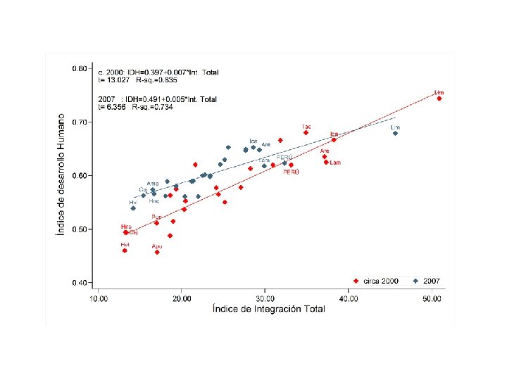 Perú: Integración y desarrollo humano 2007 1/ Integración física Integración económica % PEA Colocacio asalariadanes como Índice % del PIB % viviendas % % viviendas con camino con Índice teléfonos asfaltado electricidad fijos Integración estatal % gasto % de de contribuye Índice gobierno ntes en el PIB IDH IIIH Total 43. 0 51. 8 47. 4 15. 9 74. 1 27. 7 39. 2 14. 2 6. 6 10. 4 0. 623 32. 3 Huancavelica Cajamarca Amazonas Huánuco Ayacucho Pasco Cusco 25. 0 30. 3 28. 8 28. 3 30. 4 38. 5 29. 2 2. 14 10. 1 7. 1 13. 3 10. 1 4. 2 12. 1 13. 6 20. 2 18. 0 20. 8 20. 2 21. 3 20. 7 5. 3 9. 5 15. 1 9. 0 9. 2 7. 1 11. 3 55. 9 40. 2 48. 5 43. 1 51. 2 69. 0 64. 4 2. 9 7. 1 5. 0 7. 3 6. 6 2. 9 21. 4 18. 9 22. 9 19. 8 22. 5 27. 6 26. 2 3. 63 5. 22 5. 10 6. 07 6. 29 6. 64 14. 01 11. 6 8. 9 12. 4 12. 8 16. 5 5. 3 8. 3 7. 6 7. 1 8. 7 9. 4 11. 4 6. 0 11. 1 0. 539 0. 563 0. 574 0. 566 0. 562 0. 589 0. 580 14. 2 15. 4 16. 5 16. 7 18. 1 18. 3 19. 3 Puno Loreto San Martín Apurímac 21. 3 31. 3 29. 0 34. 1 29. 6 10. 9 20. 7 11. 3 25. 4 21. 1 24. 8 22. 7 19. 4 18. 9 20. 0 9. 4 57. 5 61. 3 59. 0 56. 6 4. 6 19. 9 11. 6 20. 1 27. 2 33. 3 30. 2 28. 7 6. 04 7. 42 6. 66 6. 44 11. 0 10. 9 11. 5 22. 7 8. 5 9. 2 9. 1 14. 6 0. 561 0. 589 0. 590 0. 561 20. 4 21. 2 21. 4 22. 0 Junín 36. 1 15. 0 25. 6 11. 6 73. 4 16. 9 33. 9 9. 25 6. 8 8. 0 0. 600 22. 5 Ucayali 36. 7 16. 6 26. 7 10. 8 64. 6 18. 4 31. 3 11. 66 9. 2 10. 5 0. 602 22. 8 Piura Ancash La Libertad 39. 2 41. 8 45. 7 15. 7 9 20. 0 27. 4 25. 4 32. 8 20. 3 19. 2 13. 8 66. 4 73. 2 71. 9 20. 5 20. 1 16. 9 35. 7 37. 5 34. 2 7. 99 8. 60 8. 83 6. 1 4. 9 7. 0 7. 3 6. 9 0. 598 0. 600 0. 621 23. 4 24. 6 Madre de Dios Moquegua Tacna Tumbes Ica Arequipa Lambayeque Lima y Callao 47. 1 42. 9 37. 3 39. 6 55. 9 47. 6 46. 7 52. 7 16. 9 5. 9 14. 0 21. 7 14. 5 16. 1 24. 2 79. 6 32. 0 24. 4 25. 7 30. 6 35. 2 31. 8 35. 5 66. 2 18. 3 22. 7 26. 1 20. 5 25. 9 23. 2 33. 7 24. 9 68. 3 80. 3 81. 6 81. 1 76. 2 84. 2 76. 1 93. 0 10. 3 17. 7 19. 1 17. 9 23. 6 28. 2 49. 7 32. 3 40. 2 42. 2 39. 9 41. 9 45. 3 46. 0 55. 9 13. 68 19. 45 23. 37 11. 29 11. 77 17. 76 10. 05 23. 99 8. 6 4. 8 6. 8 13. 8 5. 5 3. 9 6. 4 5. 8 11. 1 12. 1 15. 1 12. 6 8. 6 10. 9 8. 2 14. 9 0. 630 0. 653 0. 647 0. 649 0. 653 0. 648 0. 618 0. 679 25. 1 25. 6 27. 7 28. 6 29. 3 29. 9 45. 6 Elaboración propia sobre la base de fuentes del BCRP, INEI (Censo 2007, SUNAT,