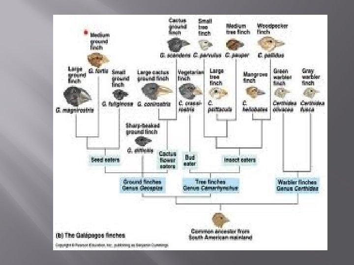 Darwin’s Finches � � 14 different species each clearly adapted to a specific niche all similar to finches on mainland SA (common ancestor)