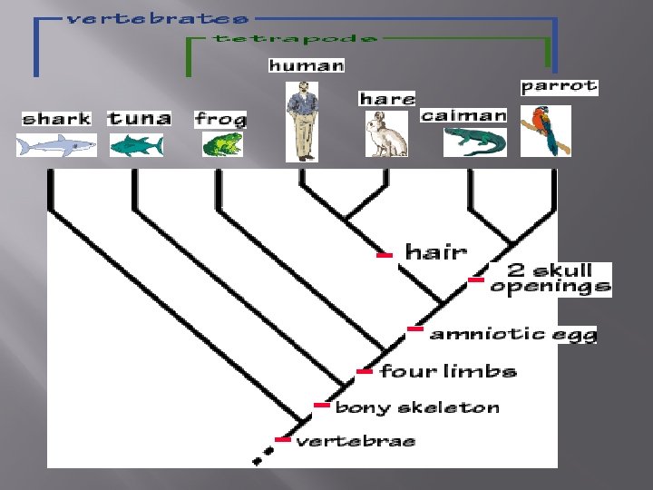 Cladogram Practice Look at the lineages of the three animals that are highlighted Which is more closely related to caimans a) Hares b) Parrots