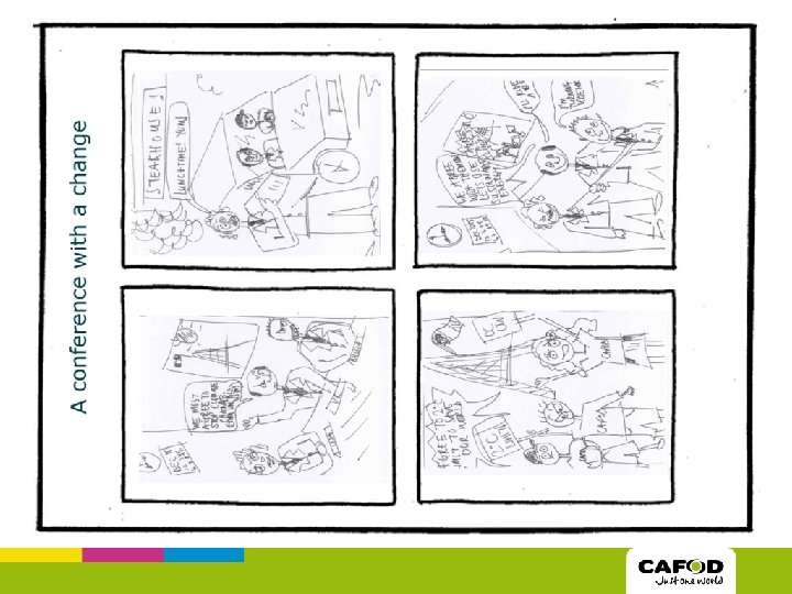 Follow up Share your comics • You need to share your comics to get your message out there! You could: • hold an exhibition in your school or parish. • email a copy to your local parliamentary candidates, if your chosen theme was climate change, so they know you want them to stop climate change pushing people deeper into poverty. • take photos of any comics on a climate change theme and share them through social media, tagging @CAFOD #One. Climate. One. World. • evaluate the impact of your comics.
